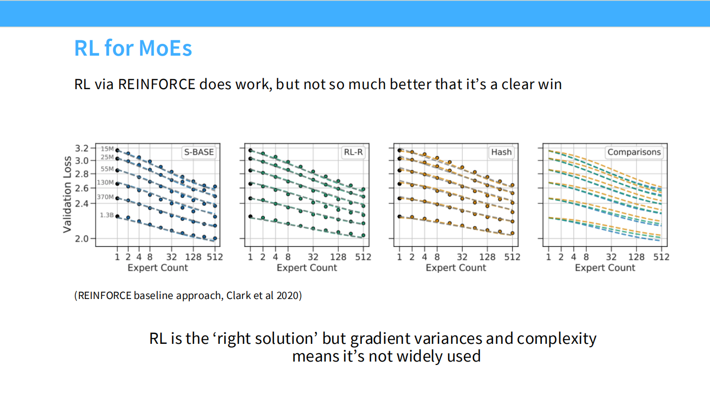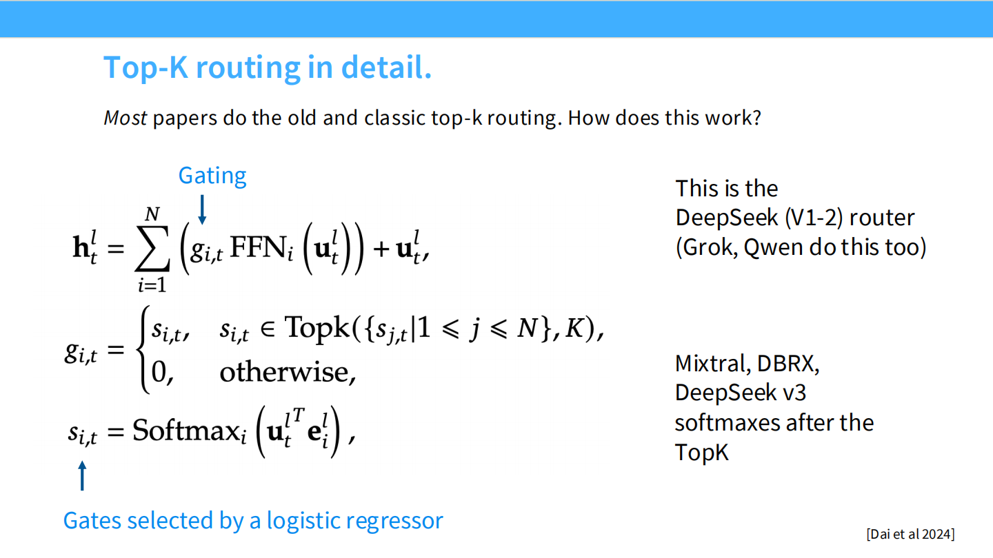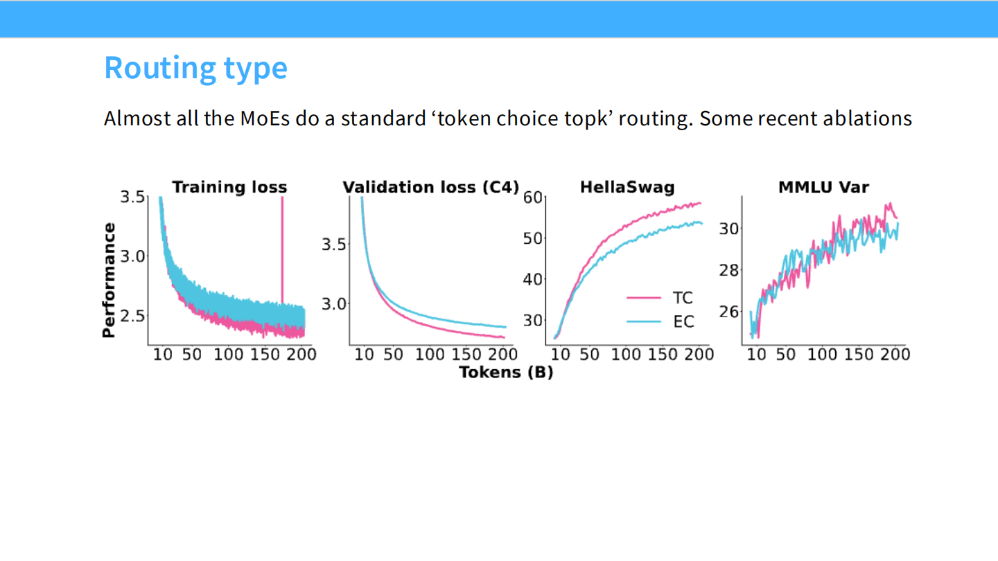 - 结论: “Almost all the MoEs do a standard token choice topk routing.” 既然复杂的 Expert Choice 并没有带来性能提升,大家自然选择实现更简单的 Top-k。