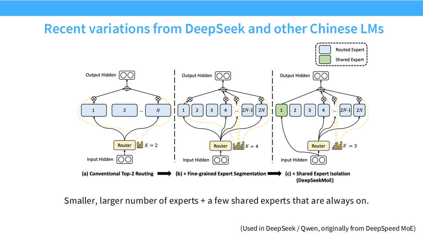 - Expert sizes (专家规模): 专家是做大做少(Mixtral: 8个大专家),还是做小做多(DeepSeek: 256个小专家)?