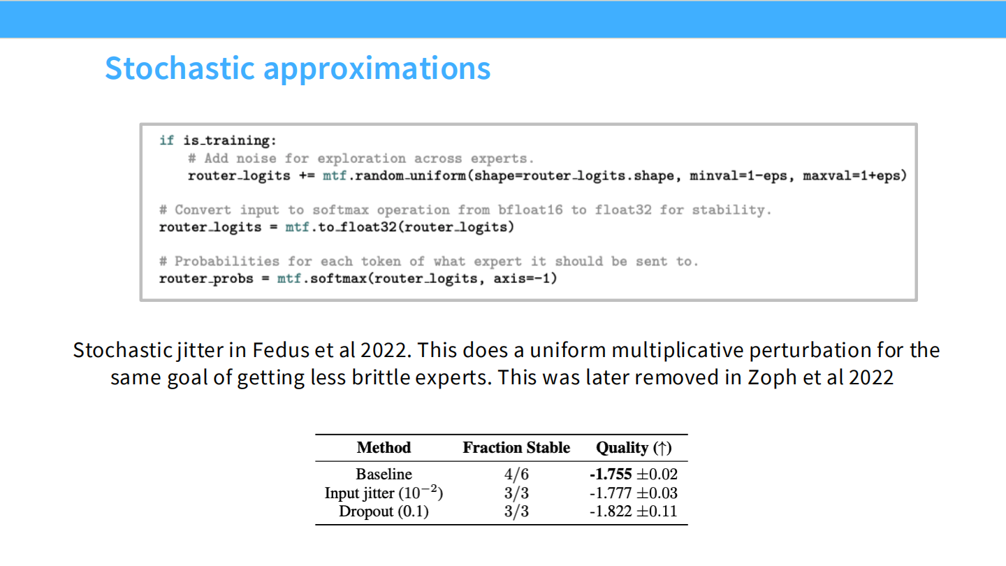 - 但后来的研究 (Zoph et al 2022) 发现,表格数据显示 Jitter 并不能提升质量(-1.777 vs -1.755 baseline),甚至可能有害。所以现代 MoE 通常移除了这一步。