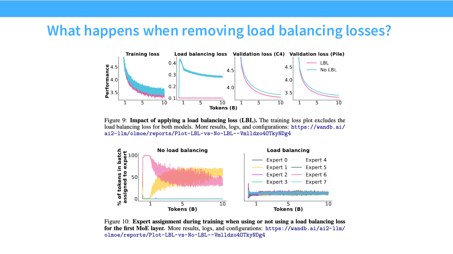 - 上图: Loss 曲线。No LBL (无负载均衡,蓝色) 的 Loss 居高不下。