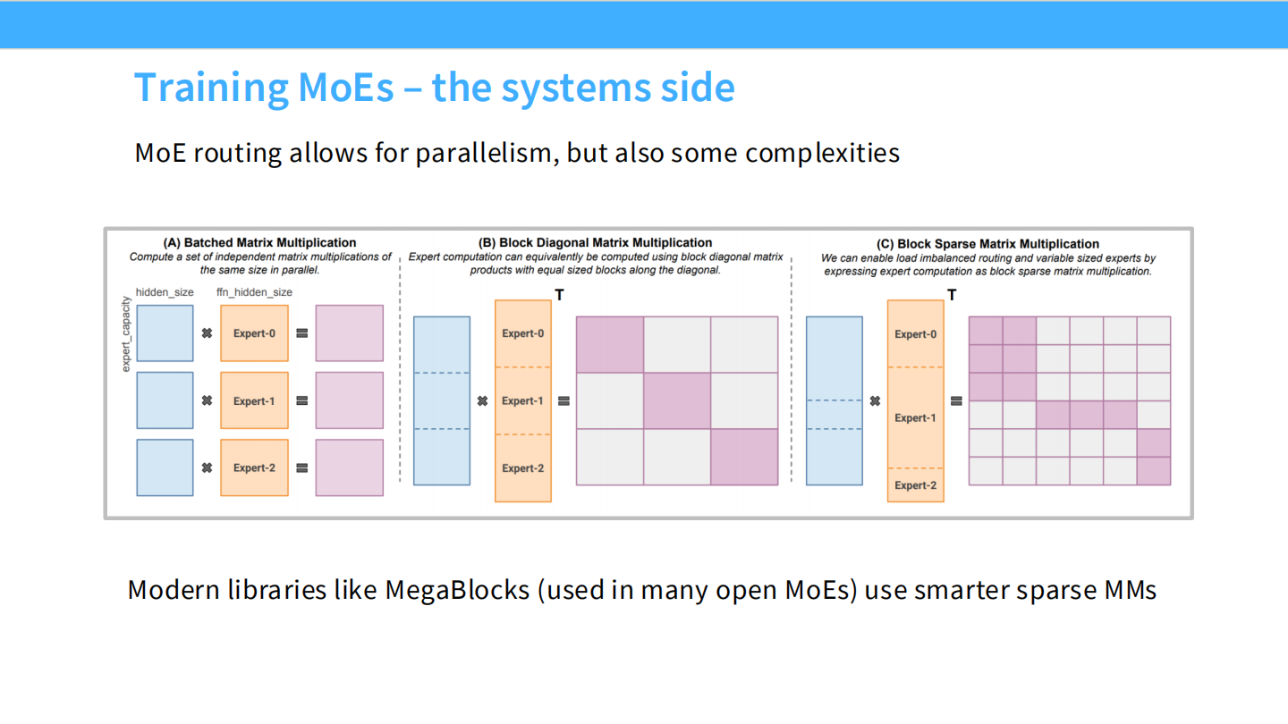 - 解法: 使用 MegaBlocks 这样的现代库,支持块稀疏矩阵乘法,可以高效处理负载不均的变长序列,大幅提升训练效率。