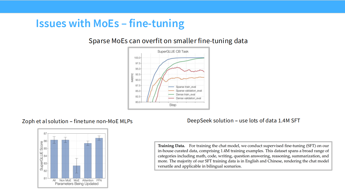 - MoE 参数量巨大,在小数据集上微调极易过拟合。