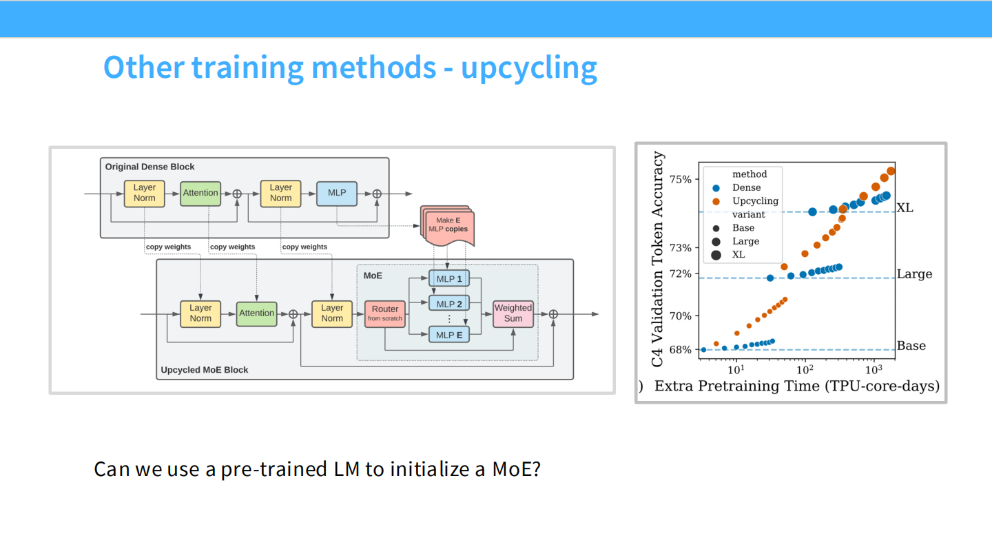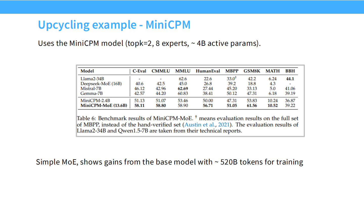 - MiniCPM 证明了 Upcycling 的有效性:仅需 ~520B tokens 的额外训练,就能让模型性能上一个台阶。