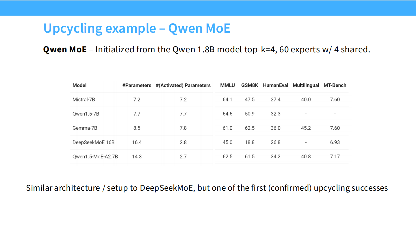 - Qwen MoE 同样是基于 Qwen 1.8B Dense 模型 Upcycling 而来的。这是业界公认的高效路径。