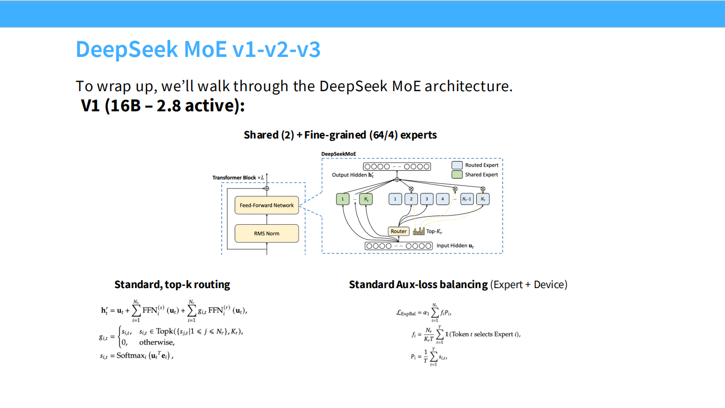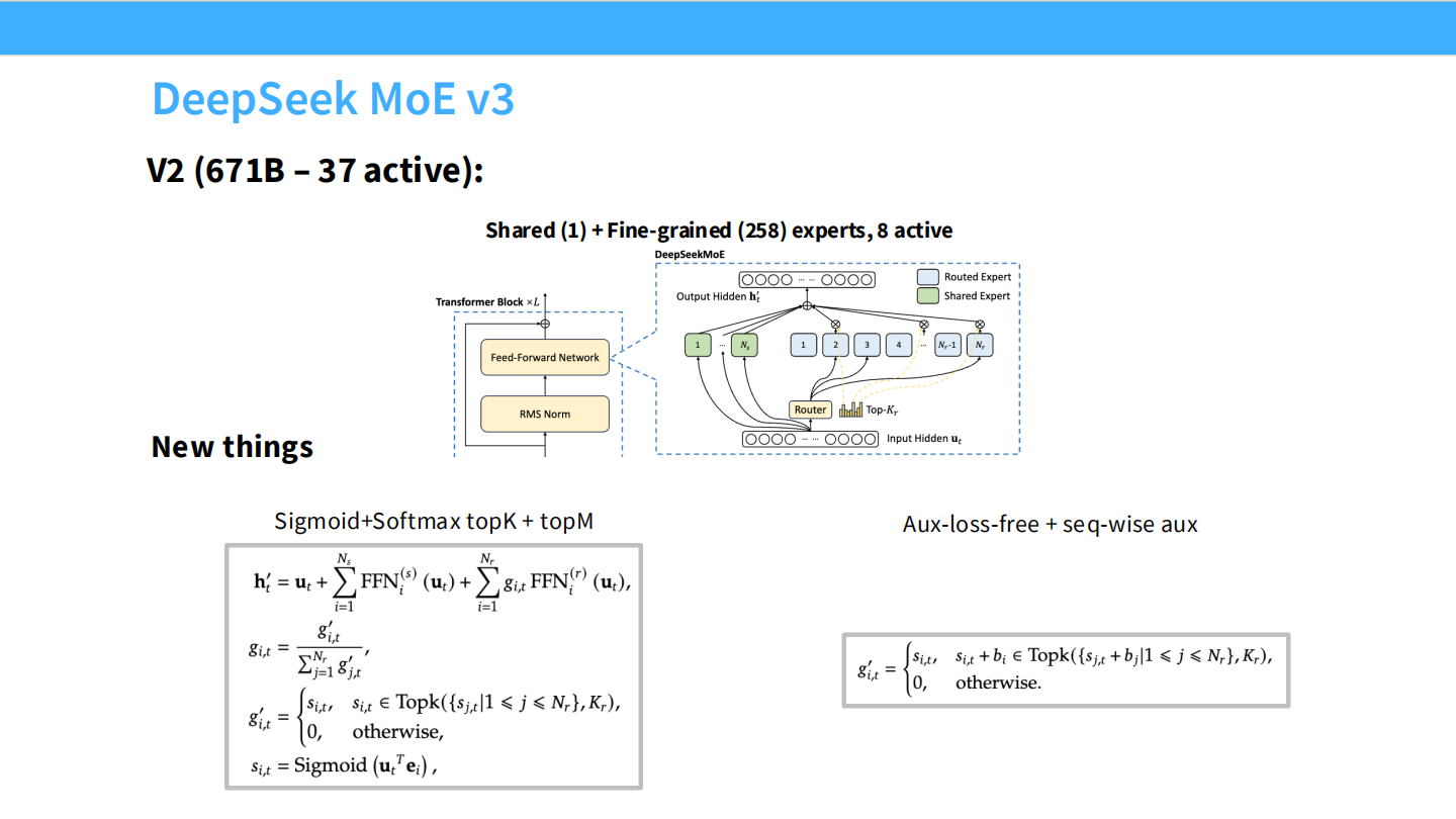Sigmoid(u^T e),能更好地区分专家。 - Aux-loss-free: 彻底移除了 Aux Loss,用 Bias 动态平衡,性能不再受损。