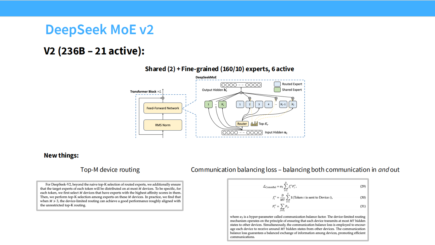 - 创新: 引入 Top-M Device Routing。为了解决数千张显卡并行的通信瓶颈,V2 限制了每个 Token 最多只能去 M 个 Device,防止通信风暴。