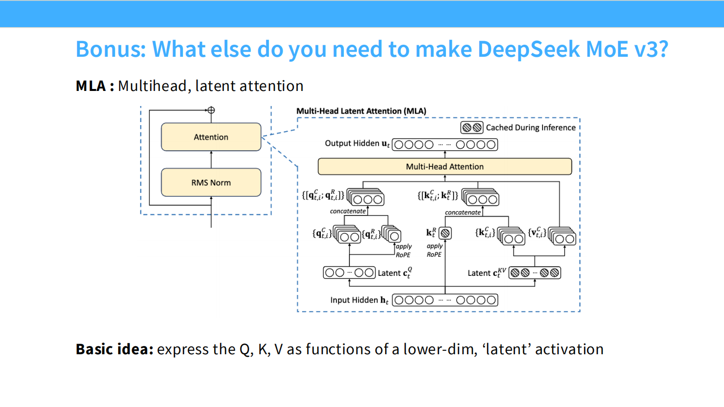 - 【视觉内容】 MLA 架构示意图。左侧是 Attention 模块,右侧放大了 KV Cache 的处理细节。