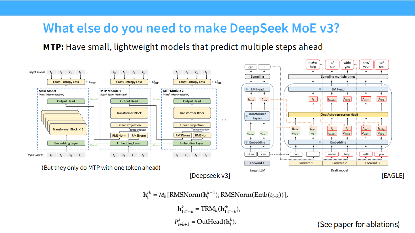 - 左图 (DeepSeek V3): Main Model 输出后,并没有结束,而是接了一个 MTP Module 1 和 Module 2。